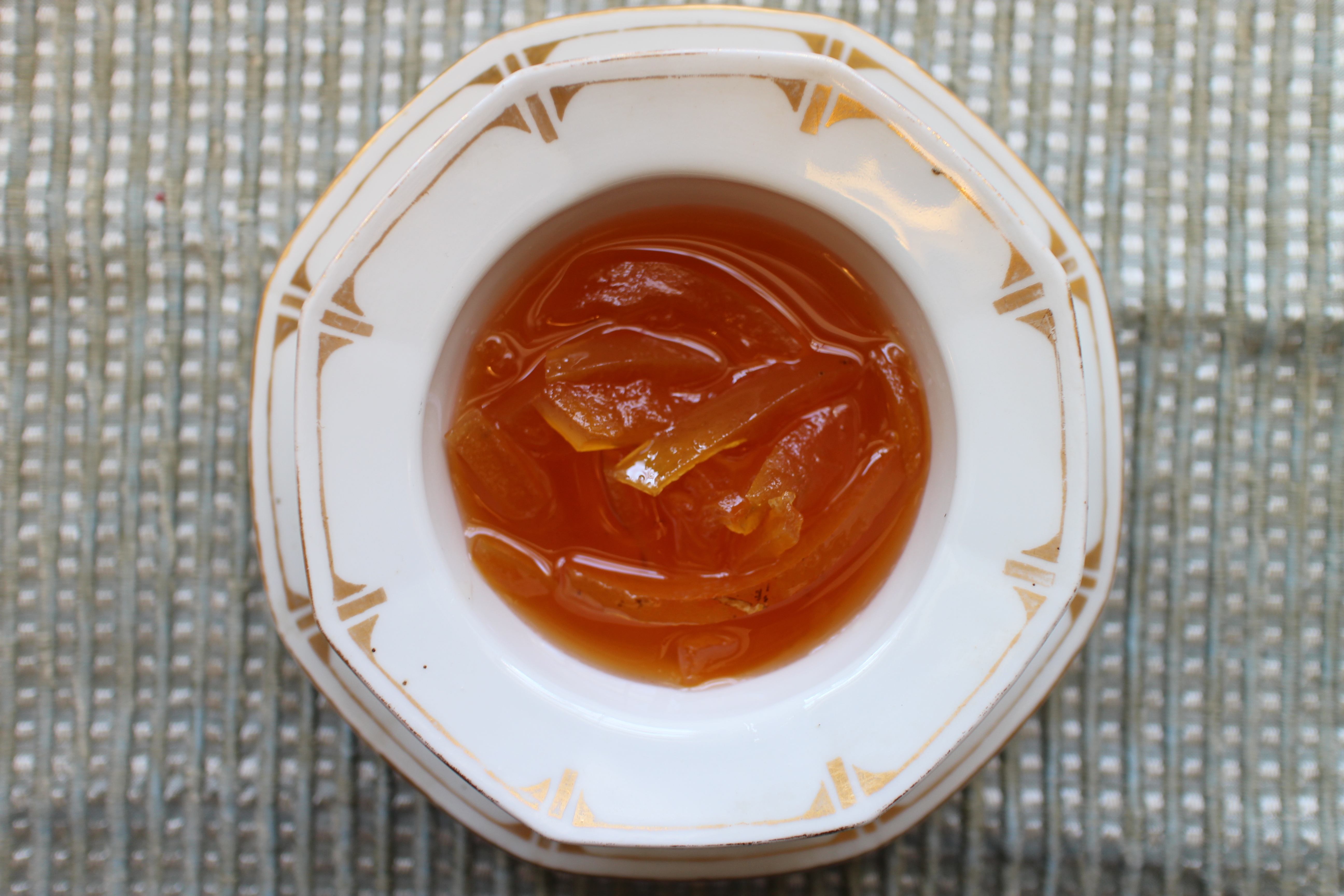 The two-step cooking process kept the rind from clouding the jelly but, as I learned, you have to be rigorous about testing the gel. I was worried about over-cooking it so I slightly undershot the gel. Even though the marmalade’s a little runny as a result, its clear bright taste shines, and I find myself spooning the syrup over all kinds of things and even added it to black tea, with the effect of a citrusy Earl Grey brew. Yum.