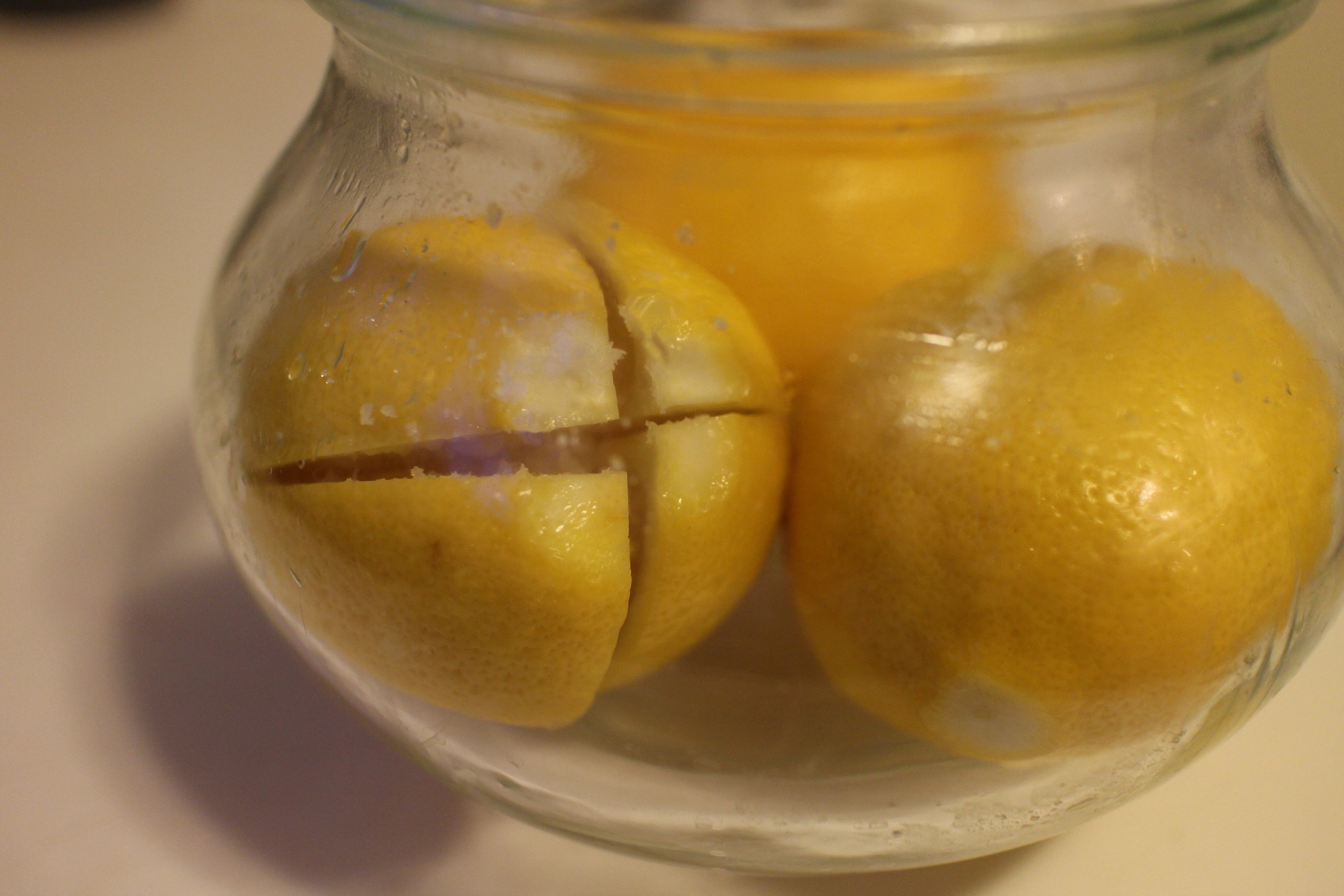 Preserved lemons are a pantry staple in our house, and I try to keep them in supply, typically putting up a big jarful twice a year. I always use organic lemons and seek those that are not waxed, since the rind is primarily what you eat (though I use the pulp and syrupy juice as well). If you suspect the fruit is waxed, wash it under warm water, dry thoroughly and set aside for a few hours until bone dry. My normal method is to quarter lemons lengthwise, stuff them in a jar with salt and lemon juice, and let them sit around for a couple of weeks, shaking the jar every so often.