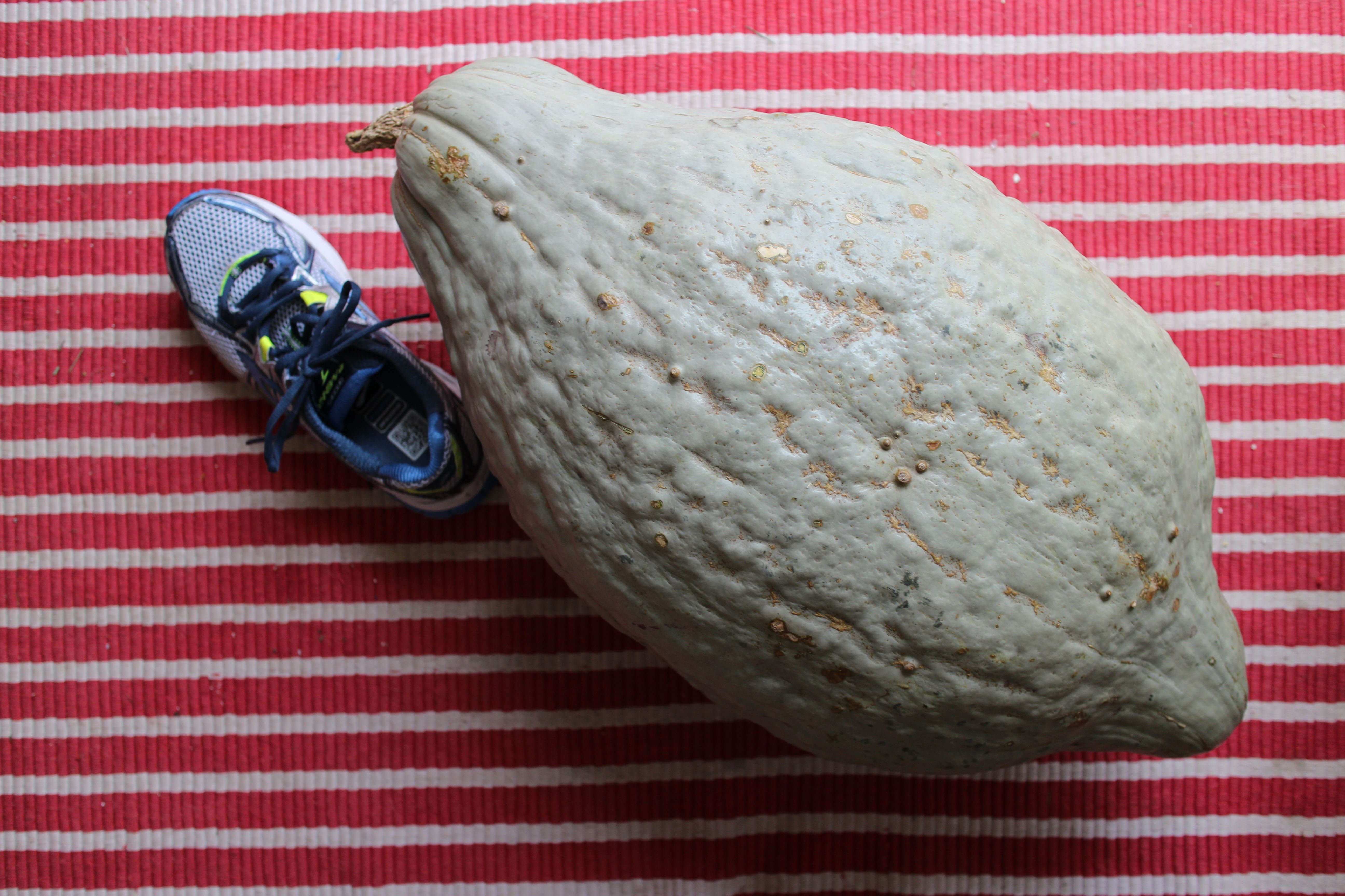 Size-6 running shoe meets big blue Hubbard squash. The hard-shelled blimp-like fellow weighed 28 pounds, was 22 inches long, and had a 38-inch waistline. What a tank. It arrived at our doorstep on Halloween and I’m only now getting around to cooking it. Blue Hubbard squash and Long Island cheese pumpkins (I still have one of those too) last for months after their harvest, so long as they are kept in a cool place out of sunlight and don’t have any nicks. Even the slightest bruise or dent, and they’ll rot.