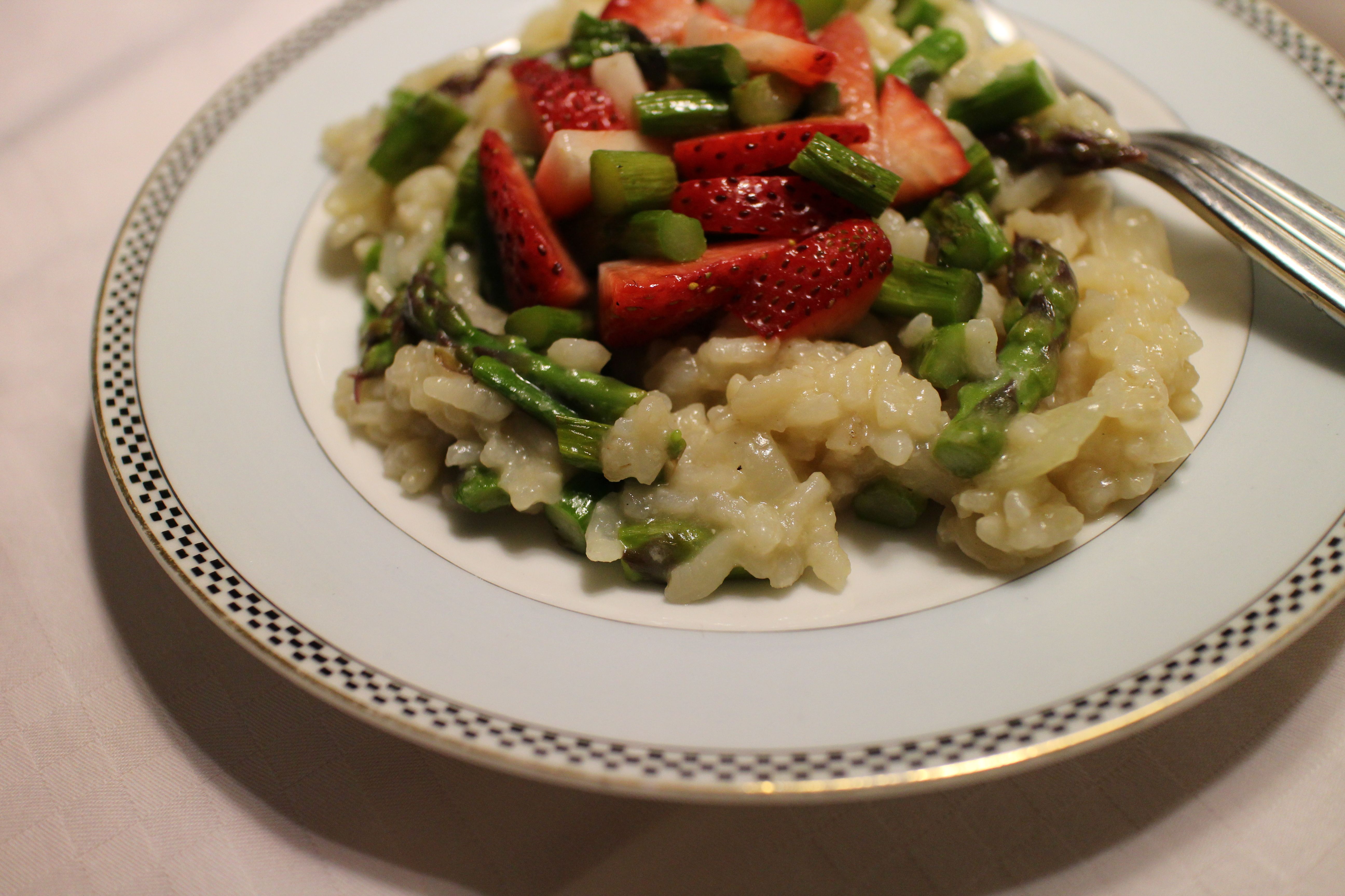 Make the risotto. Warm the broth or stock Warm the butter or oil in a saucepan. Add the onions and cook over medium heat until translucent. Do not let them brown. Add rice and stir to coat, cooking until the surface of the grains turns white. Add the wine and stir to allow it to evaporate and also instill the ingredients with flavor. Add 1/3 cup of warm liquid, adjusting the heat to so that the liquid just simmers and stir until it is absorbed. When the liquid is absorbed, add another 1/3 cup, wait until it’s absorbed, stirring occasionally, and then repeat until the rice is tender but still al dente. This process will take about 20-25 minutes. About 5 minutes or so before the risotto is fully cooked, add the roasted asparagus stalks and the raw tips and stir to combine well. When the risotto is cooked, add the grated cheese, if using, taste for salt and adjust as needed. Garnish with strawberries. Serves 3-4.