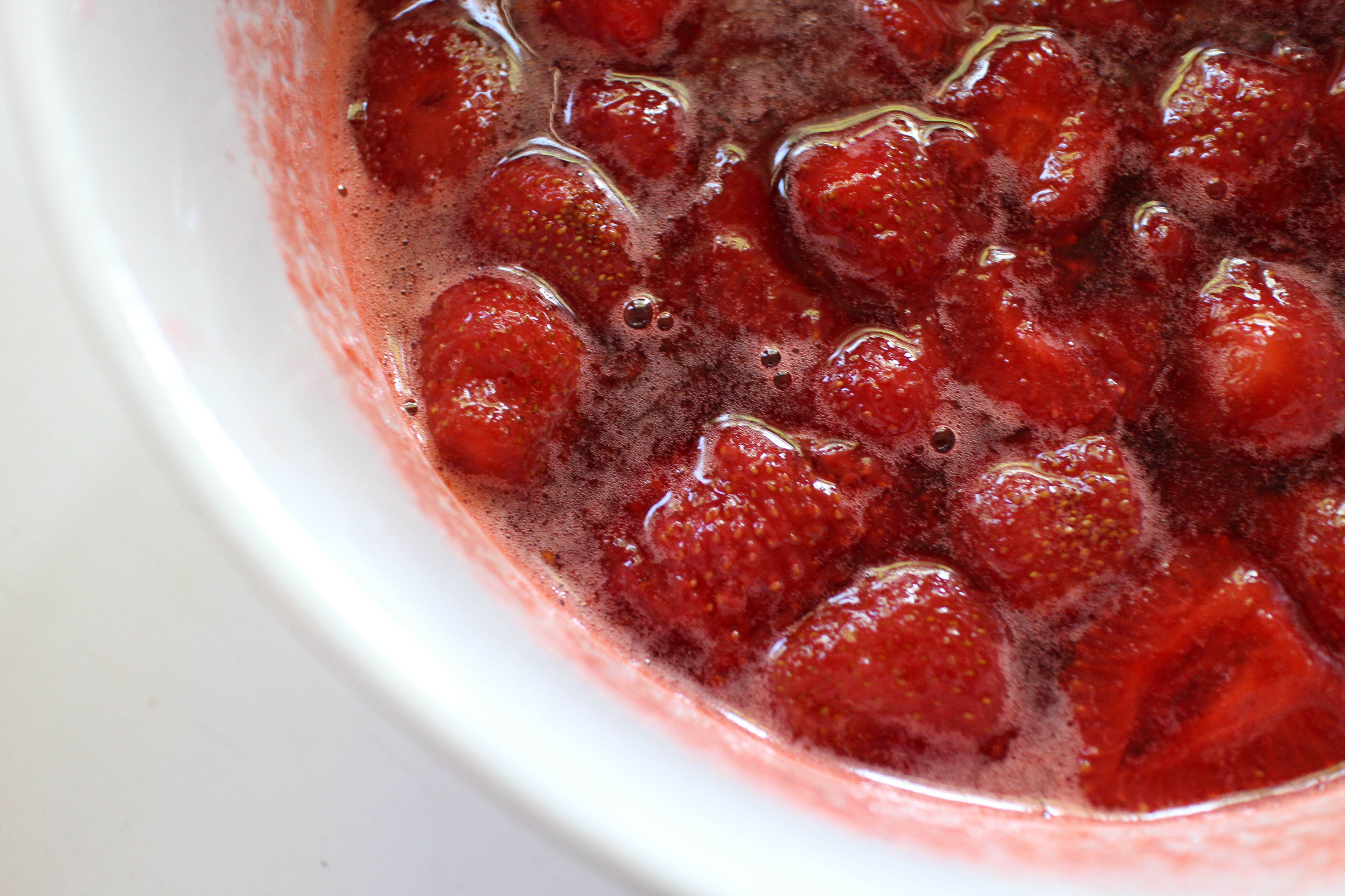 Place the strawberries and their liquid in a wide shallow pan and bring to a boil. Cook for 4 minutes, pour the ingredients back into the glass bowl and let cool. Refrigerate overnight.
