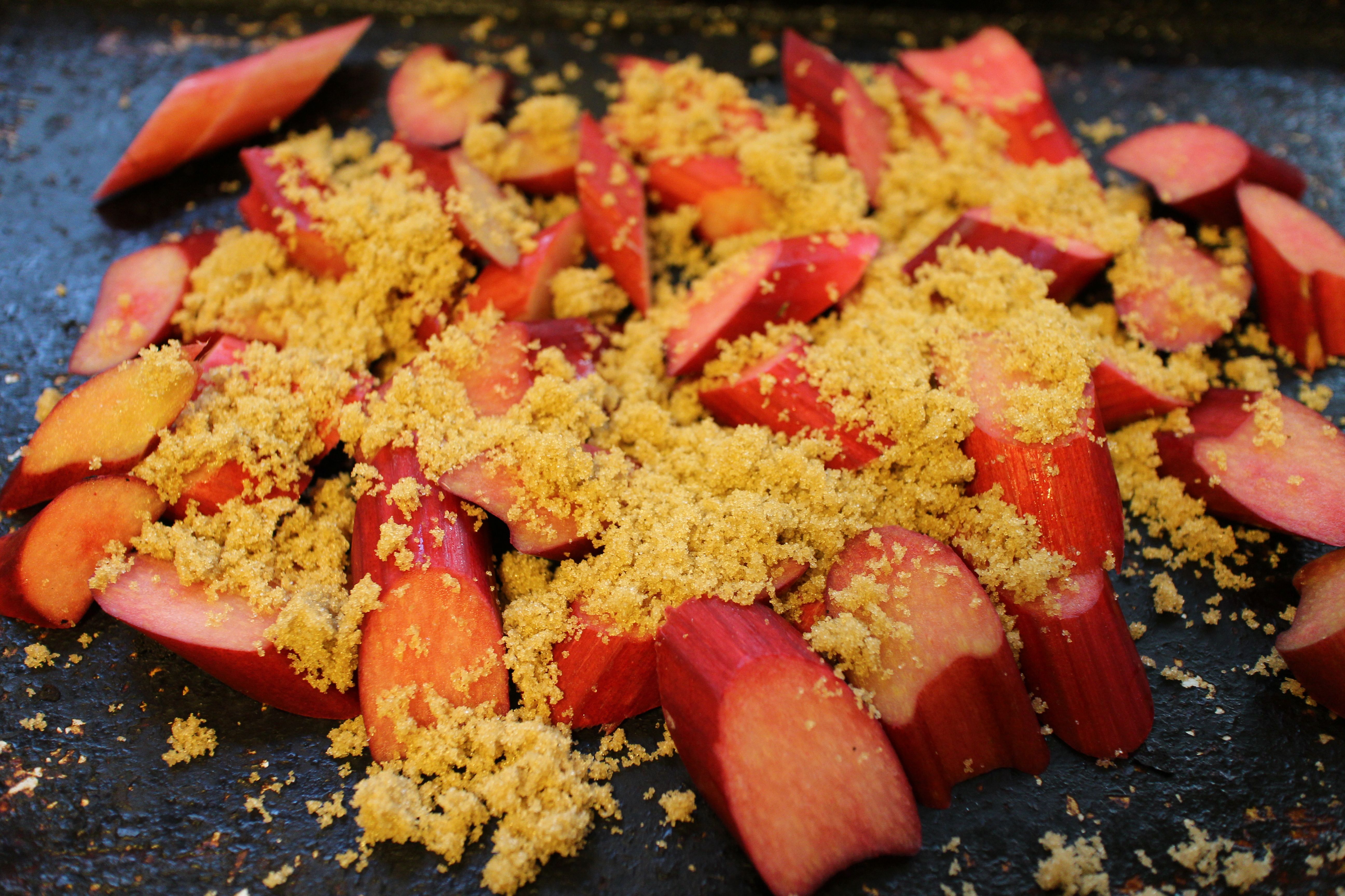 Heat the oven to 350 degrees. Clean the rhubarb and cut into ½-inch pieces. Sprinkle with brown sugar and roast for about 10 minutes until the rhubarb softens but has not collapsed. Set aside.