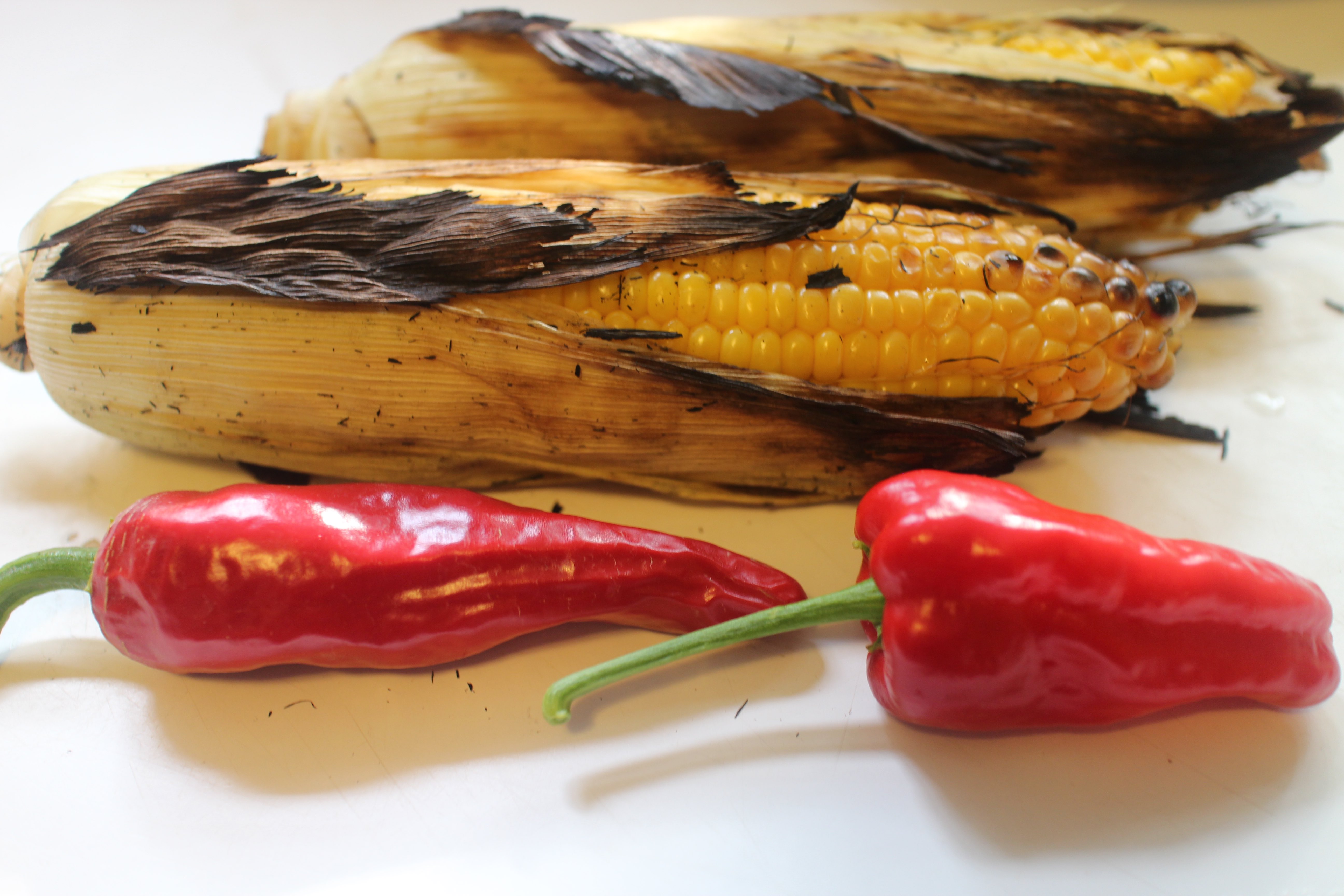 The key is the quality of the liquid. The book’s greatest contribution to my cooking repertoire is fish stock, made from otherwise discarded fish carcasses, a waste not want not move that is satisfying in every way. Here, after a picnic that featured corn salad and roasted corn on the cob, I cooked the leftover cobs and some of the roasted husks in water to make broth, and added the roasted corn kernels to the soup. This coincided with the first harvest of red peppers from my garden, Aleppos and Chimayos and Pimentos and Padrons. The result was a richly flavored and slightly smoky chowder with a kick of hot peppers, perfect for the impending turn of the season. And I loved putting those leftovers to good use.